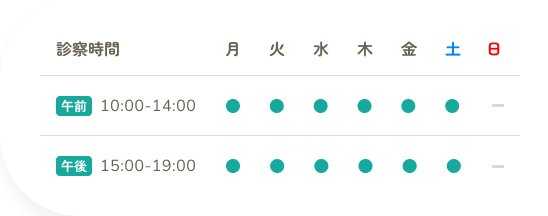 | 診療時間 | 月 | 火 | 水 | 木 | 金 | 土 | 日 |