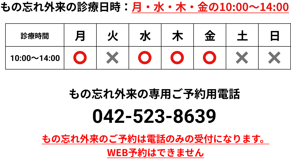 「もの忘れ」は予約制となっております。ご予約は、お電話 042-656-2627 までお願いいたします。